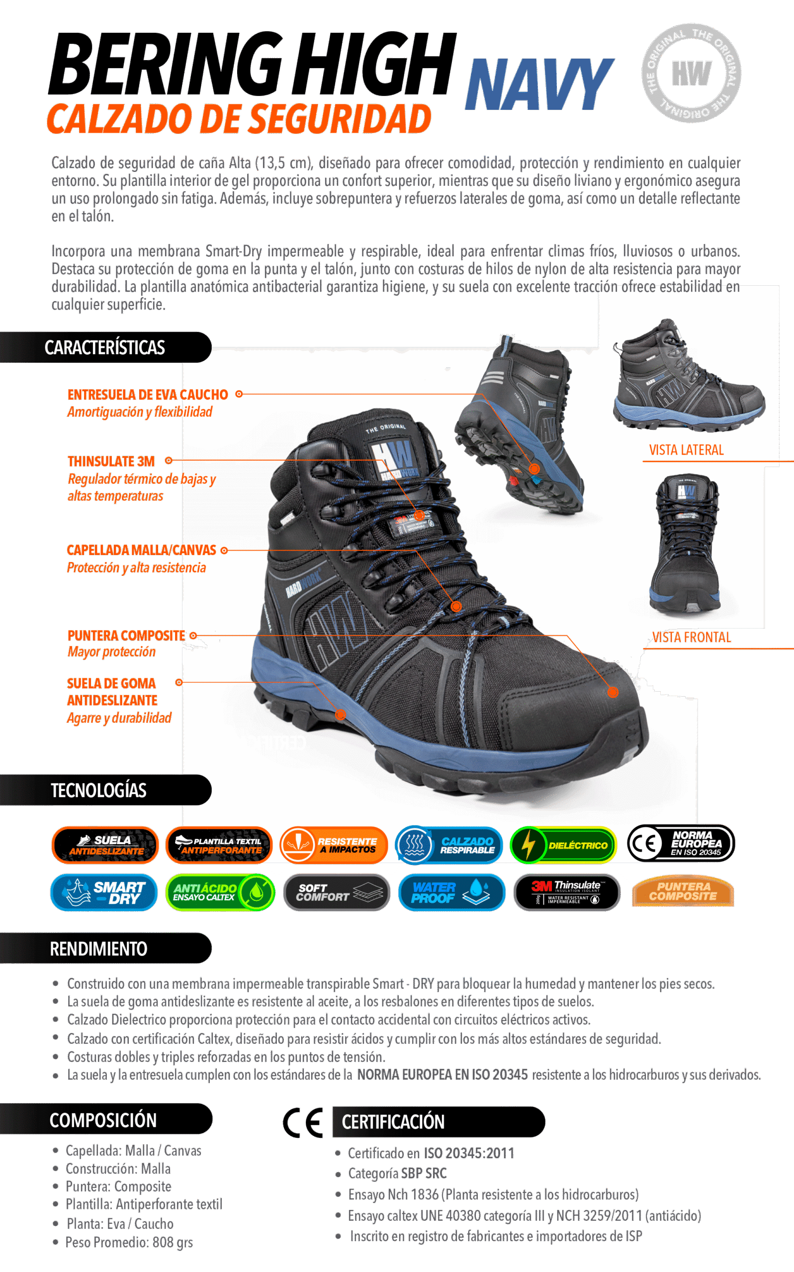 Calzado de seguridad de caña alta (13,5 cm) diseñado para brindar comodidad, protección y rendimiento en cualquier entorno. Incorpora plantilla interior de gel y anatómica antibacterial, ofreciendo confort e higiene en uso prolongado. Su membrana Smart-Dry es impermeable y respirable, ideal para climas fríos o lluviosos. Destaca su sobrepuntera, refuerzos laterales, detalle reflectante, costuras de nylon de alta resistencia y suela con gran tracción para máxima estabilidad.