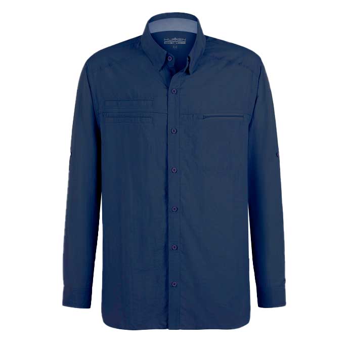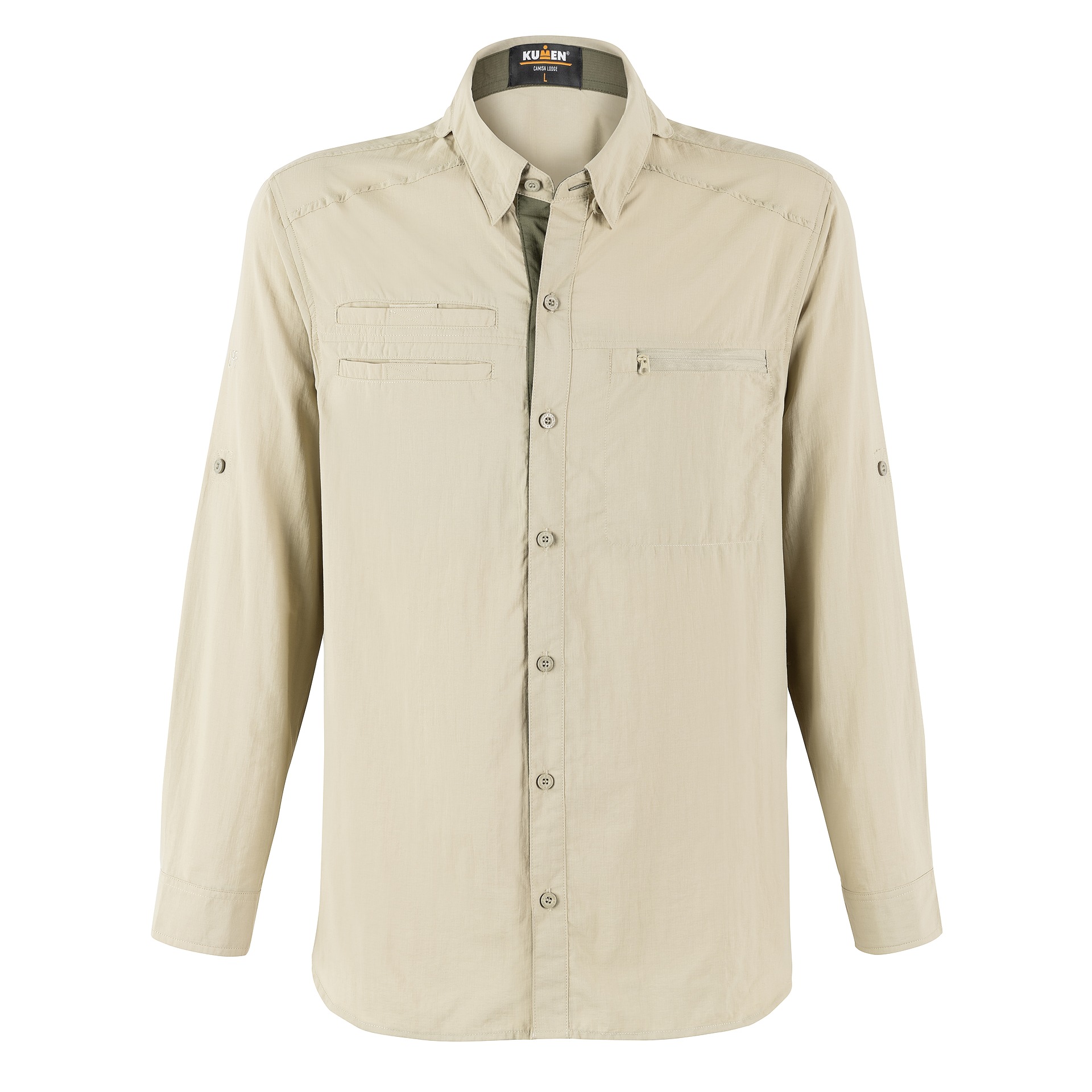 Camisa Kumen Outdoor, confeccionada en nylon ripstop resistente al desgarro y ligera, con ventilación, protección UPF +50, cubrenuca, bolsillos seguros y tratamiento repelente.